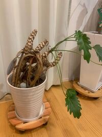 セロームとクッカバラはどこまでも似ていた 同じフィロデンドロン属の2株は 気根を出す時期も出す場所も一緒で 葉柄が弱々しく 傘を広げたように広がる ところも一緒