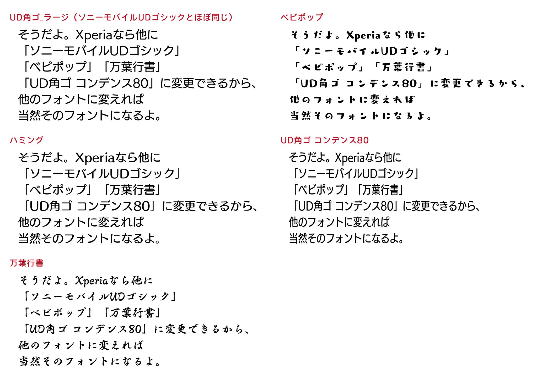 Takumi Anything Can T Make From Nothing On Twitter Xperiaに搭載されているシステムフォントはこの5つだが 標準のソニーモバイルudゴシックとハミング以外使い物にならない どうしてこれらのフォントをチョイスしたのか